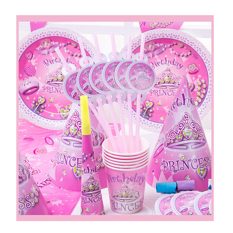 Venta al por mayor de suministros para fiestas infantiles platos y vasos de papel servilletas corona Rosa decoración de fiesta de cumpleaños juegos de vajilla de fiesta desechables